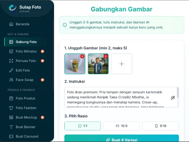 Unggah 2-5 gambar, tulis instruksi, dan biarkan AI menggabungkannya menjadi sebuah karya baru yang unik.