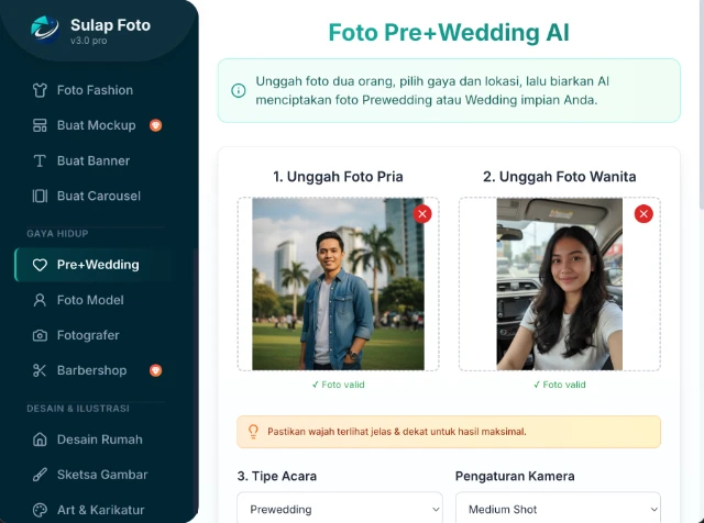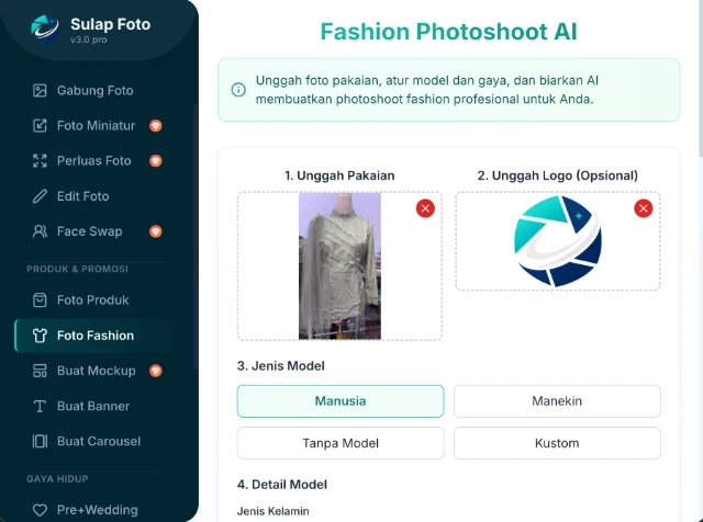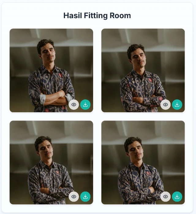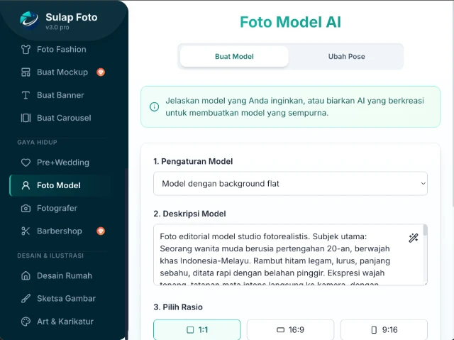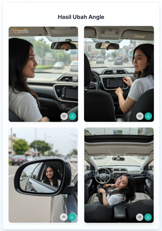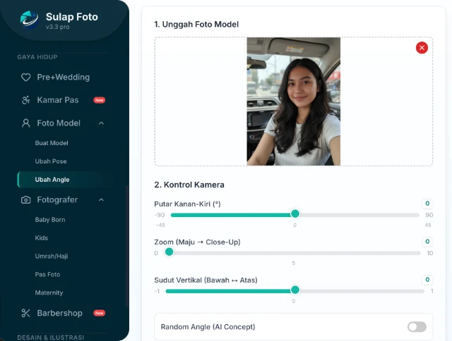 Unggah foto model dan atur sudut kamera secara presisi, atau biarkan AI menciptakan angle kreatif secara acak.