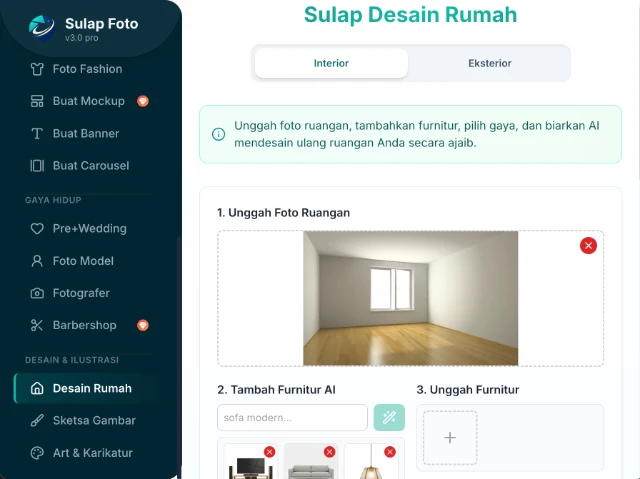 Foto ruangan kamu, tambahkan furnitur, biarkan sulap foto mendesainnya!