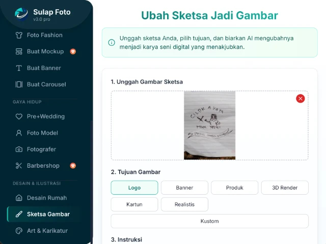 Upload coretan sketsa anda dikertas, sulap foto akan buat sesuai desain anda